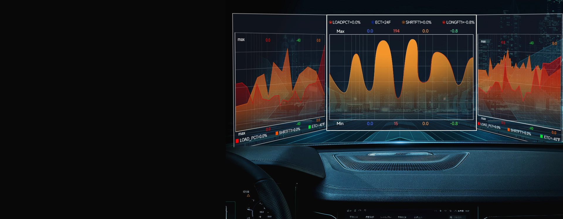It shows live vehicle sensors data in text and graph formats. You can view 2 parameter graphs simultaneously and merge them into one coordinate.