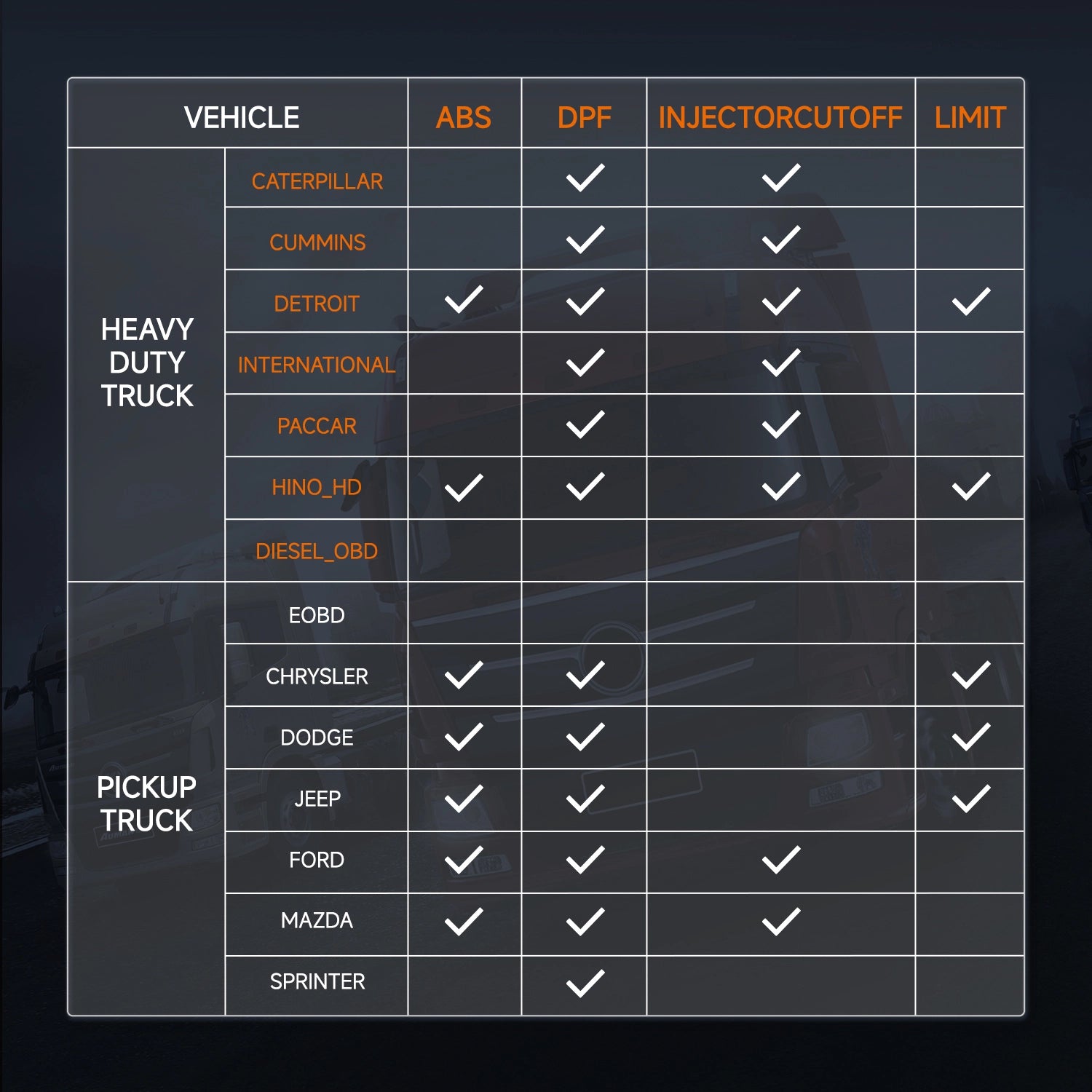 NOTE: Service functions vary by vehicle's model. If you are not sure about compatibility, please check the compatibility with us. Make sure that your engine is compatible with J1587, J1939, J1708, J27145, ISO9141-2, ISO14230-2, ISO15765-4.