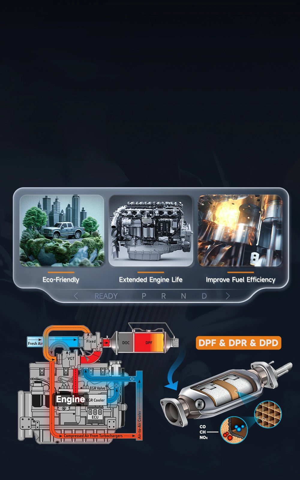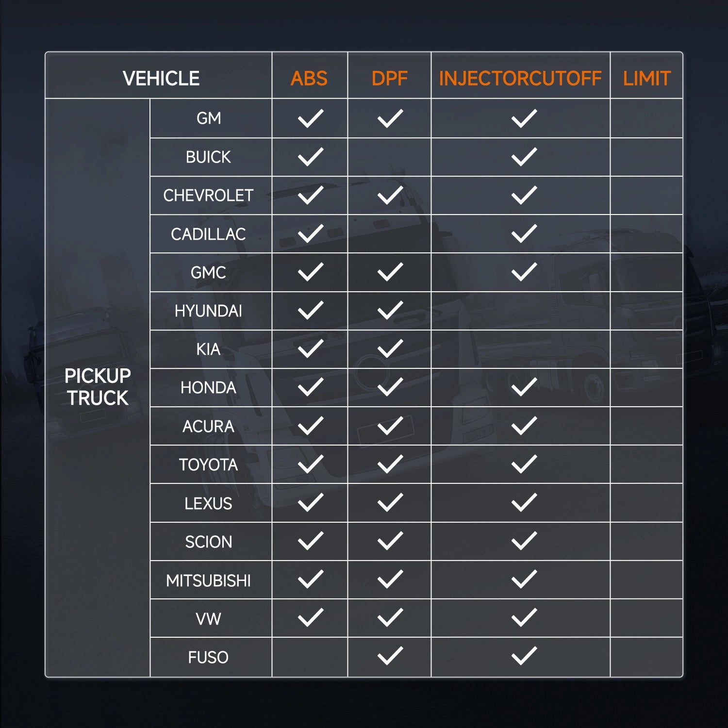 Support the most common required special functions like DPF Regeneration, Speed Limit Settings, Injector Cutoff, ect.