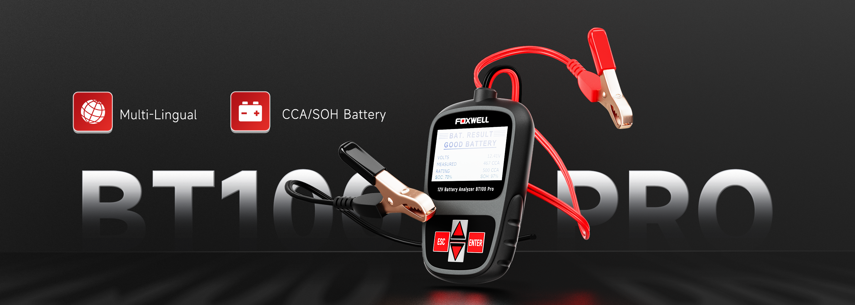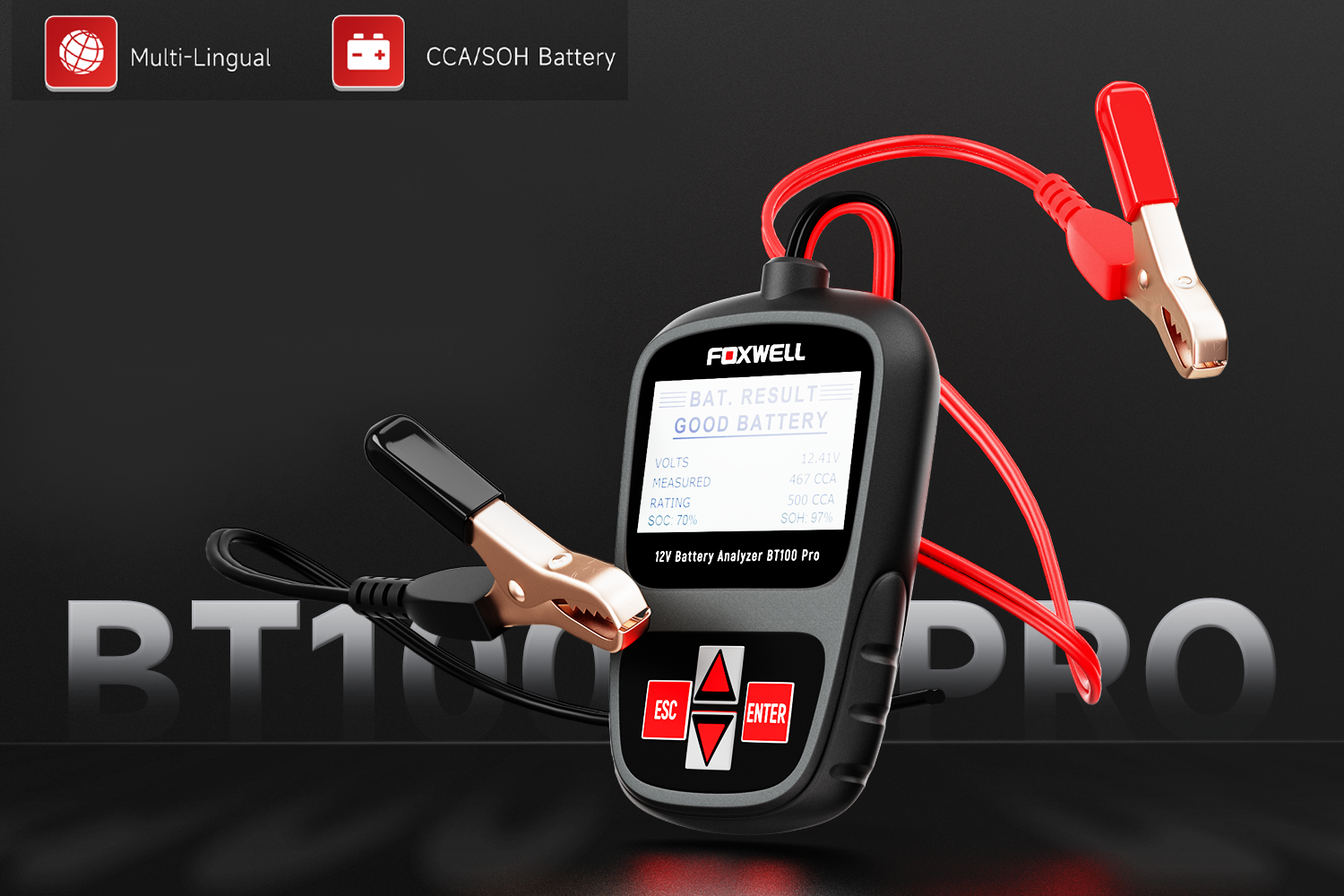 The latest BT100 Pro 12 Volt Battery Analyzer from Foxwell is dedicatedly developed to test 12V regular flooded, AGM flat plate, AGM spiral and gel batteries. It provides a quick, easy and affordable solution for technicians to view battery charging status, check battery health and detect faults.